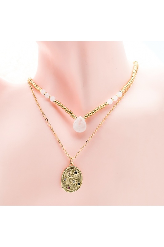 Collier double pierre de lune et son médaillon serti lune et étoile strass