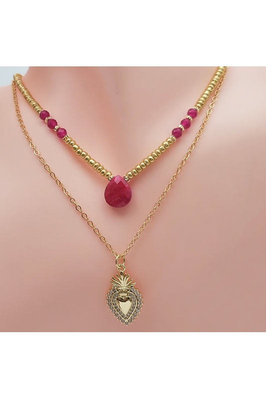 La chaine perlée pailleté or de 35cm ainsi que les pierres de rubis facette de 4mm ajoute une touche de tendresse et d'harmonie ,la goutte de 9x6m se loge au creux du cou incarne amour et protection