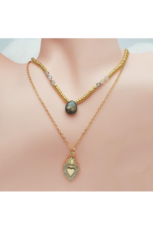 La chaine perlée pailleté or de 35cm ainsi que les perles de labradorite facette de 4mm ajoute une touche de douceur et d'apaisement .